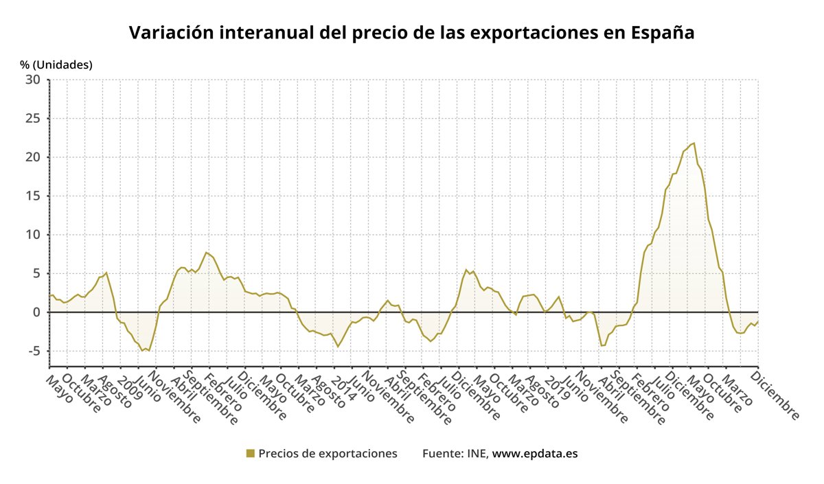 Sin contar la energía, la tasa anual de índice general de precios de las exportaciones repuntó cinco décimas en diciembre, hasta el 0,7%, situándose 1,9 puntos por encima de la tasa del índice general.