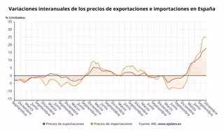 Variación interanual del precio de las exportaciones y de las importaciones industriales en España (INE) - EPDATA