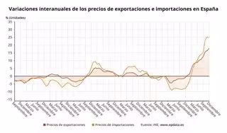 Variación interanual del precio de las exportaciones y de las importaciones industriales en España (INE) - EPDATA