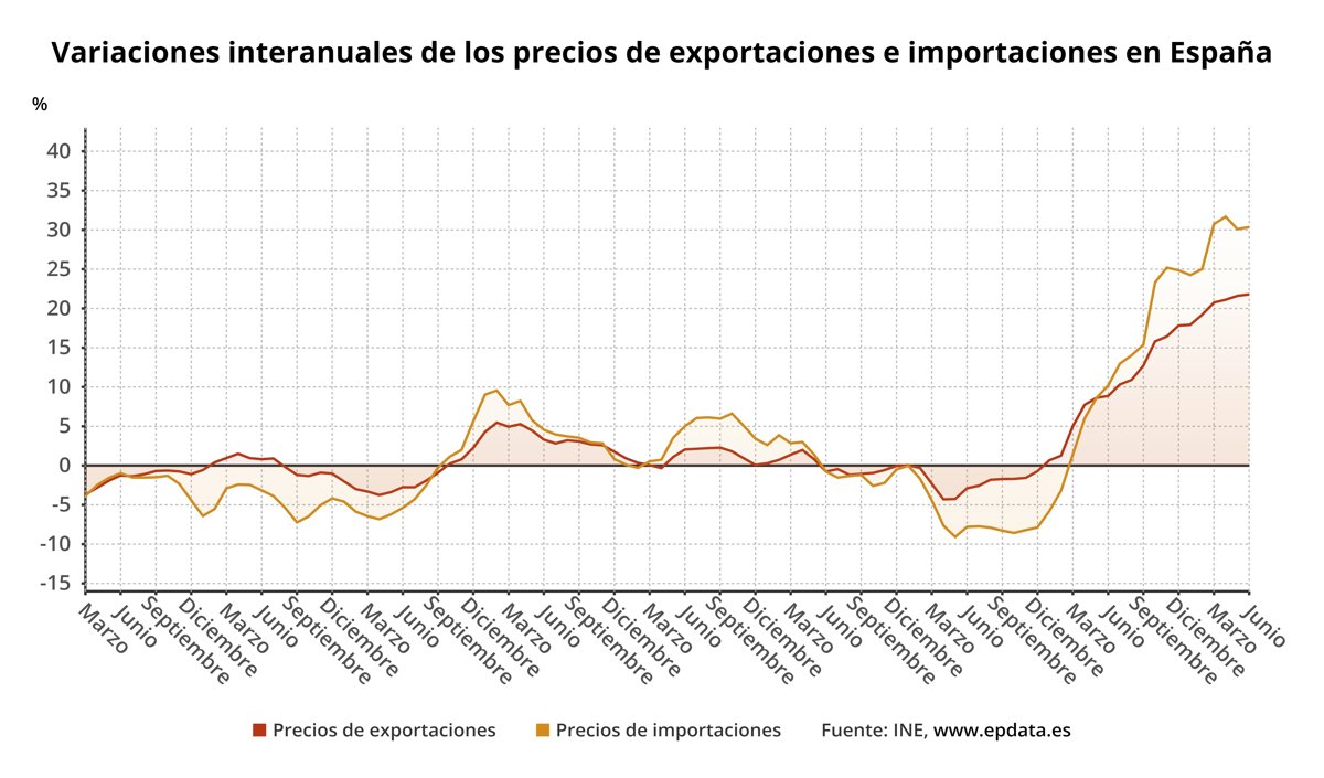 Por su parte, los precios de importación de los productos industriales se incrementaron un 30,4% en comparación con junio de 2021, tres décimas por encima respecto a la tasa registrada el mes anterior.