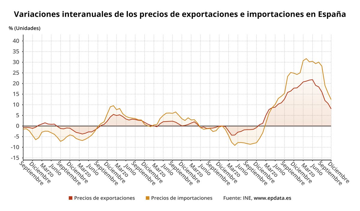 Con las cifras de diciembre de 2022, los precios de las exportaciones encadenan 24 meses consecutivos de avances interanuales, mientras que los de las importaciones suman 22 meses de tasas positivas.
