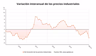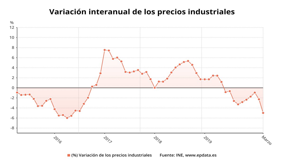Los precios industriales bajaron un 3,1% en marzo en relación al mes anterior, su mayor recorte mensual de toda la serie histórica, iniciada en 1975, y retrocedieron un 5% en tasa interanual, registrando su mayor disminución desde mayo de 2016, según ha informado este viernes el Instituto Nacional de Estadística (INE), que ha explicado que estos datos están afectados parcialmente por la declaración del estado de alarma ante la crisis sanitaria.
