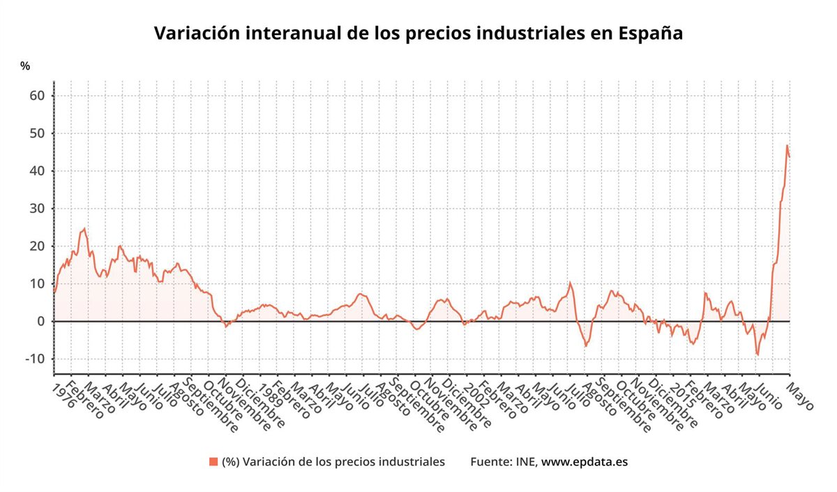 Los precios industriales subieron un 0,9% el pasado mes de mayo en relación al mes anterior y se dispararon un 43,6% en tasa interanual. No obstante, esta tasa se ha moderado nueve décimas respecto a la registrada en abril, según ha informado este lunes el Instituto Nacional de Estadística (INE).