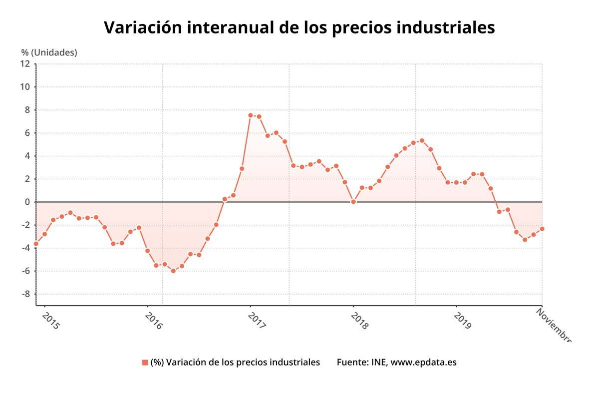 Los precios industriales bajaron un 0,5% en noviembre en relación al mes anterior y retrocedieron un 2,3% en tasa interanual, moderando en cinco décimas la caída que habían experimentado en octubre (-2,8%), según ha informado este lunes el Instituto Nacional de Estadística (INE).