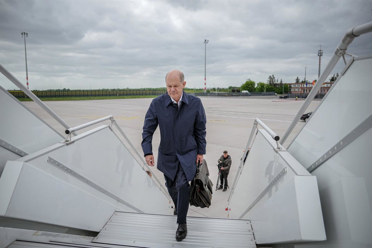 16 May 2023, Schoenefeld: German Chancellor Olaf Scholz walks to the Air Force Airbus A350 on the military section of BER Berlin-Brandenburg Airport for the flight to Iceland, ahead of The Council of Europe summit. Photo: Kay Nietfeld/dpa - Kay Nietfeld/Dpa