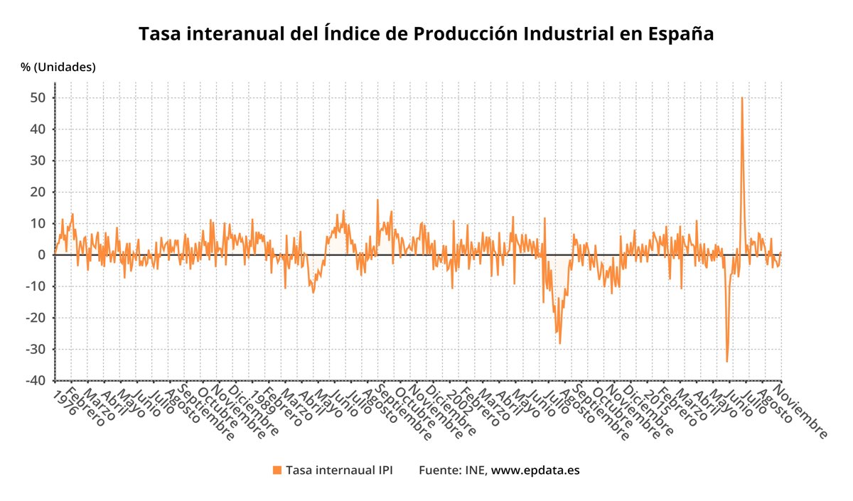 El Índice General de Producción Industrial (IPI) subió un 1,1% interanual el pasado mes de noviembre, tasa medio punto superior a la de octubre, según ha informado este jueves el Instituto Nacional de Estadística (INE).