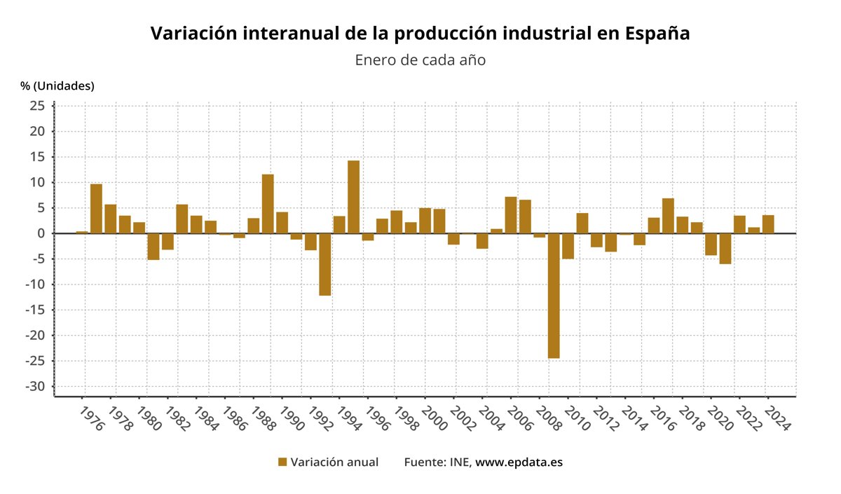 El Índice General de Producción Industrial (IPI) volvió a tasas positivas en enero al subir un 3,6% en comparación con el mismo mes de 2023, tasa que supera en 8,5 puntos la del mes anterior y su mayor alza interanual de los últimos diez meses, según ha informado este viernes el Instituto Nacional de Estadística (INE).