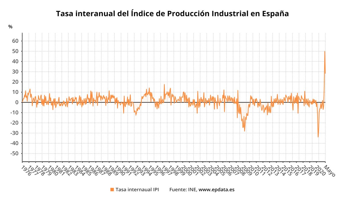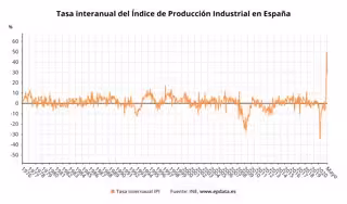 El Índice General de Producción Industrial (IPI) se disparó un 28,2% en mayo en relación al mismo mes de 2020, aunque esta tasa, pese a ser muy elevada, se moderó 22 puntos respecto al mes de abril, cuando este indicador aumentó un 50,2%, su mayor alza desde 1975.