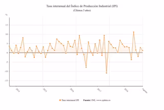 Por sectores industriales, energía (+5,8%), bienes de equipo (+1,6%) y bienes de consumo no duradero (+0,6%) presentaron tasas mensuales positivas, frente a los bienes de consumo duradero (-0,4%) y bienes intermedios (-0,3%).