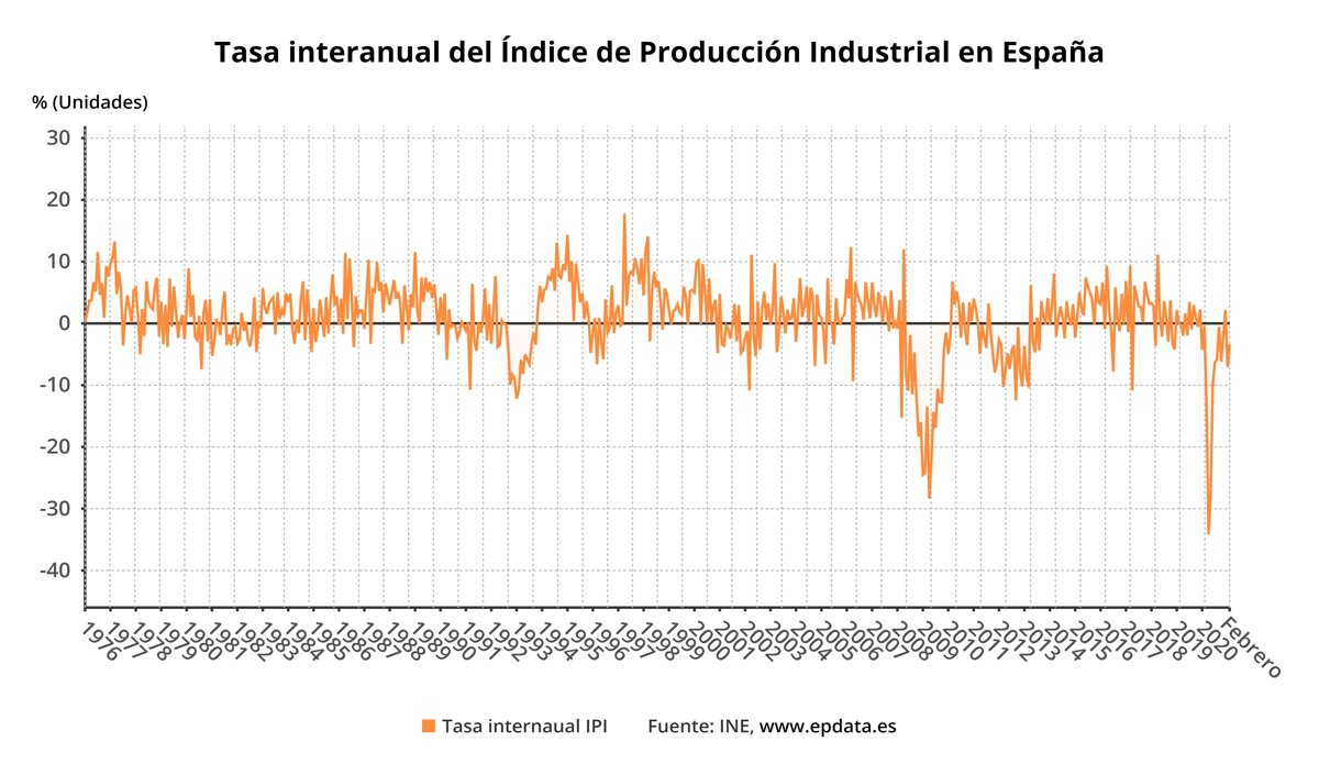 El Índice General de Producción Industrial (IPI) retrocedió un 3,4% en febrero en relación al mismo mes de 2020, moderando en 3,6 puntos la caída experimentada en enero (-7%), según ha informado este viernes el Instituto Nacional de Estadística (INE).