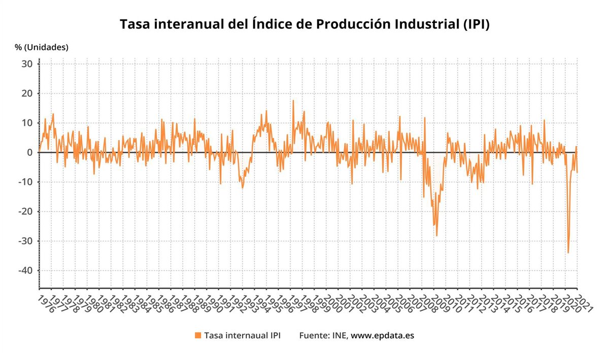 Con la caída interanual de enero, la producción industrial regresa a tasas negativas después de que en enero subiera un 2,2% y registrara su primera tasa positiva tras once meses de descensos.