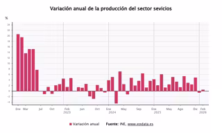 La producción del sector servicios subió un 0,5% en febrero en relación al mismo mes de 2025, volviendo así a tasas interanuales positivas después de que en enero cayera por primera vez en año y medio, según los datos publicados este martes por el Instituto Nacional de Estadística (INE).