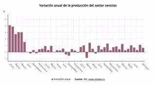 La producción del sector servicios se incrementó un 3,2% interanual en octubre, tasa 2,3 puntos inferior a la del mes anterior, según los datos publicados este viernes por el Instituto Nacional de Estadística (INE).
