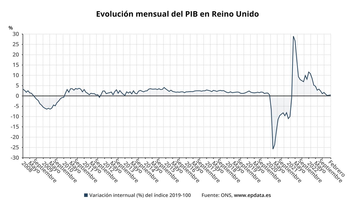 En términos interanuales, en febrero el PIB del Reino Unido aumentó un 0,5% respecto del mismo mes de 2022, después de que en enero el incremento anual haya sido revisado al alza, hasta el 0,4%, frente al estancamiento estimado inicialmente.
