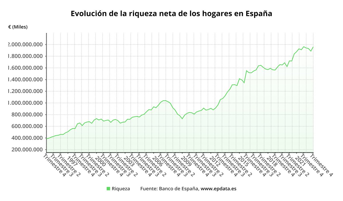 La riqueza financiera neta de las familias españolas e instituciones sin fines de lucro al servicio de los hogares (ISFLSH) se situó en 1,96 billones de euros en 2022, lo que supone un descenso del 0,2% en tasa interanual, según las cuentas financieras publicadas por el Banco de España este miércoles, que reflejan también una caída de la deuda de los hogares, moderándose su peso sobre el PIB al 53% del PIB, frente al 58,4% de un año antes.