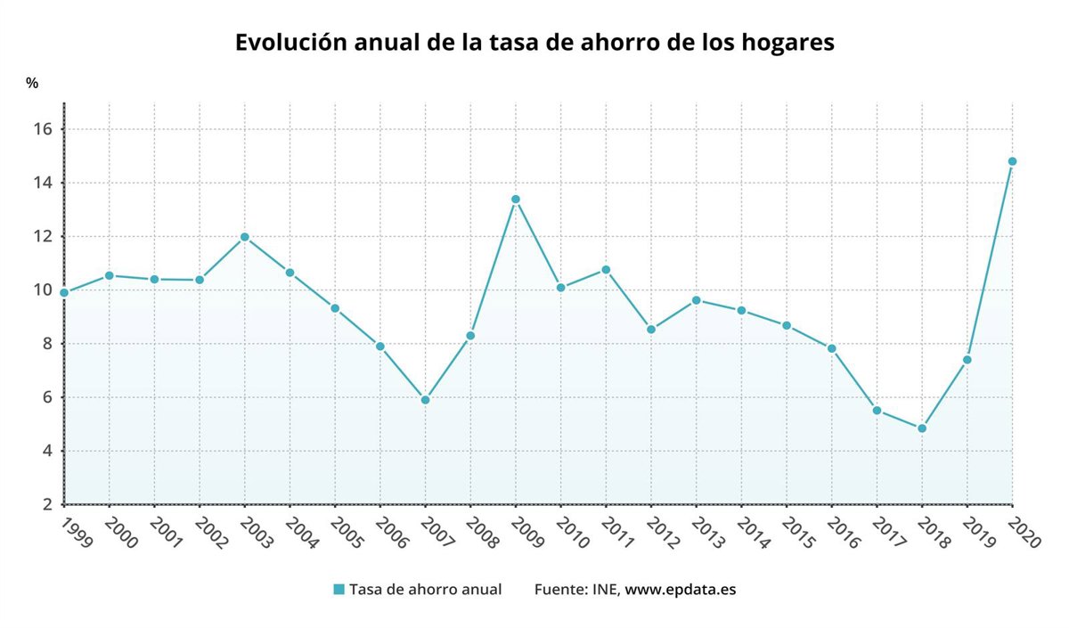 Los hogares españoles situaron en 2020 su tasa de ahorro en el 14,8% de su renta disponible, tasa 8,5 puntos superior a la de 2019 y la más alta de toda la serie, iniciada en 1999, según ha informado este miércoles el Instituto Nacional de Estadística (INE).