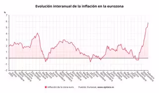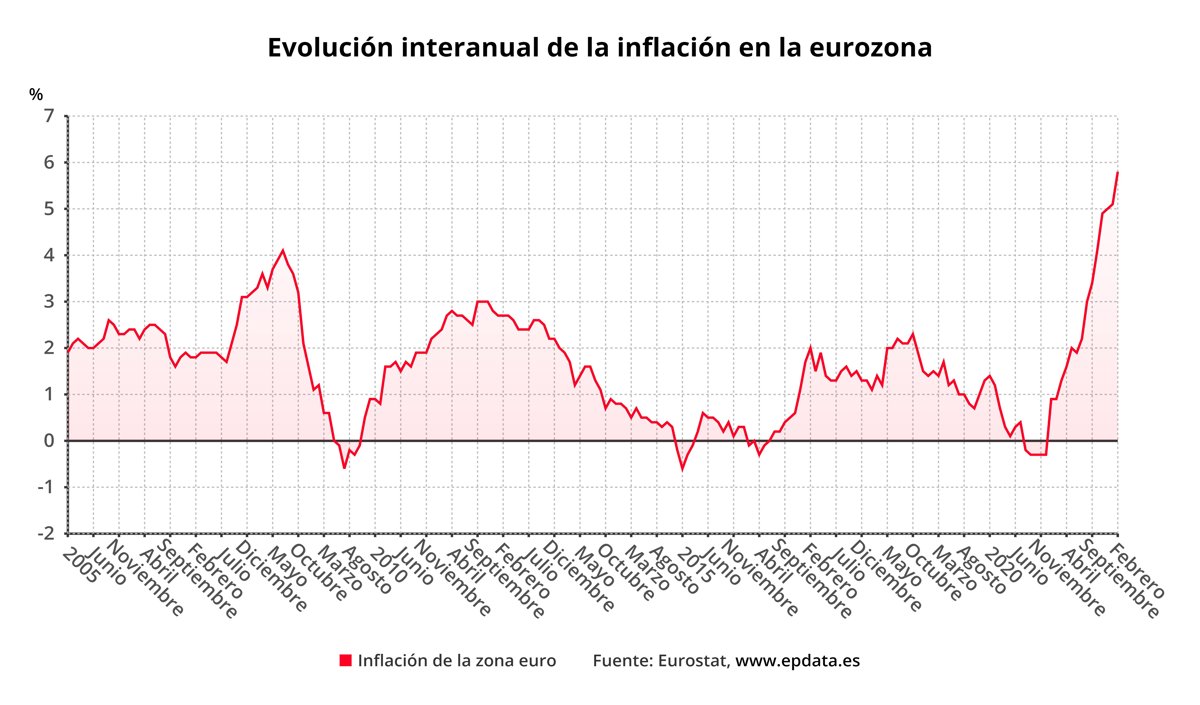 La tasa de inflación interanual de la zona euro se situó en febrero en el 5,8%, siete décimas por encima de la subida observada en enero, lo que supone el mayor encarecimiento de los precios en la región del euro de toda la serie histórica, según el dato adelantado por la oficina comunitaria de estadística, Eurostat.