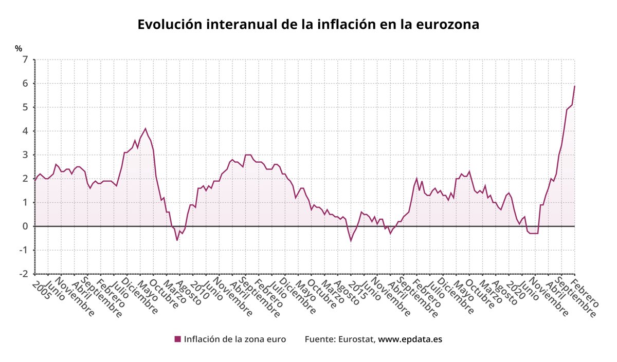 La tasa de inflación interanual de la zona euro se situó en febrero en el 5,9%, ocho décimas por encima de la subida observada en enero, en lo que supone el mayor encarecimiento de los precios en la región del euro de toda la serie histórica, según la segunda lectura del dato realizada por la oficina comunitaria de estadística, Eurostat, que ha revisado una décima al alza el índice.