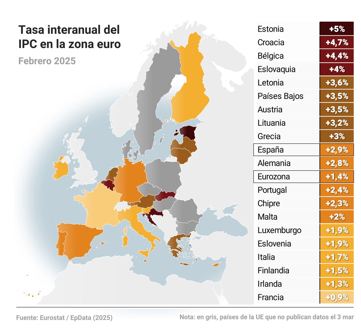Entre los países de la eurozona, las mayores tasas de inflación en febrero correspondieron a Estonia (5%), por delante de Croacia (4,7%) y de Bélgica (4,4%), mientras que las menores subidas de precios se observaron en Francia (0,9%), Irlanda (1,3%) y Finlandia (1,5%).