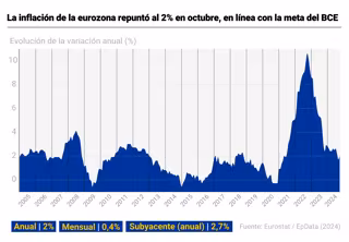 La tasa de inflación interanual de la zona euro se situó en octubre en el 2%, tres décimas por encima de la subida de los precios observada en septiembre y en línea con la meta de estabilidad del Banco Central Europeo (BCE), según ha confirmado Eurostat.