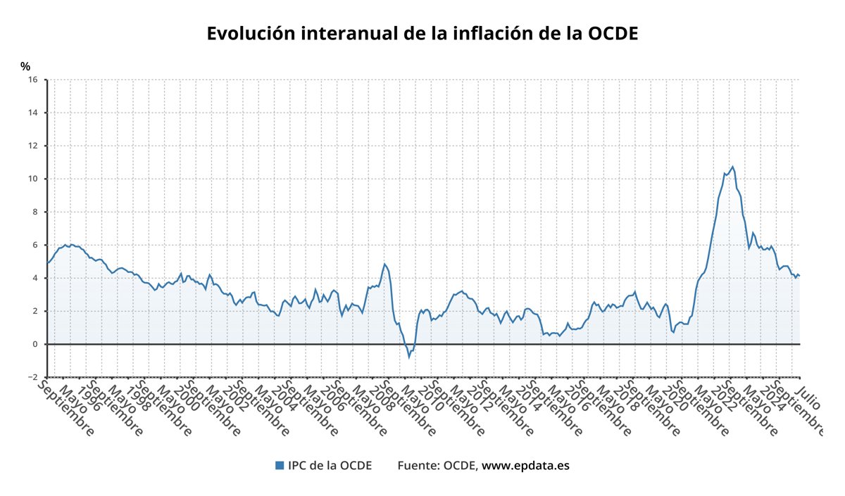 La tasa de inflación interanual de la Organización para la Cooperación y el Desarrollo Económico (OCDE) se situó el pasado mes de julio en el 4,1%, una décima menos que lo registrado en junio.