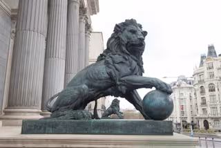 Estatuas de leones en la entrada del Congreso de los Diputados durante el estado de alarma decretado por el coronavirus, en Madrid (España), a 16 de marzo de 2020. - Joaquin Corchero / Europa Press - Archivo