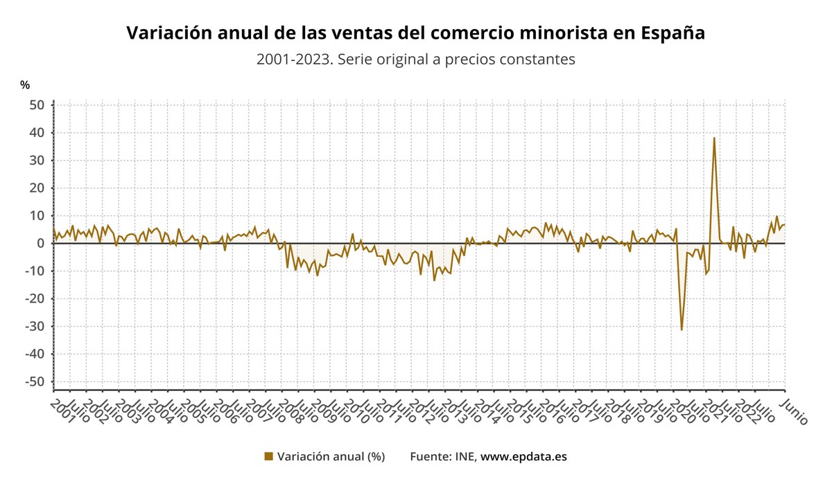 Con el dato de junio, las ventas del comercio minorista encadenan siete meses consecutivos de tasas interanuales positivas.