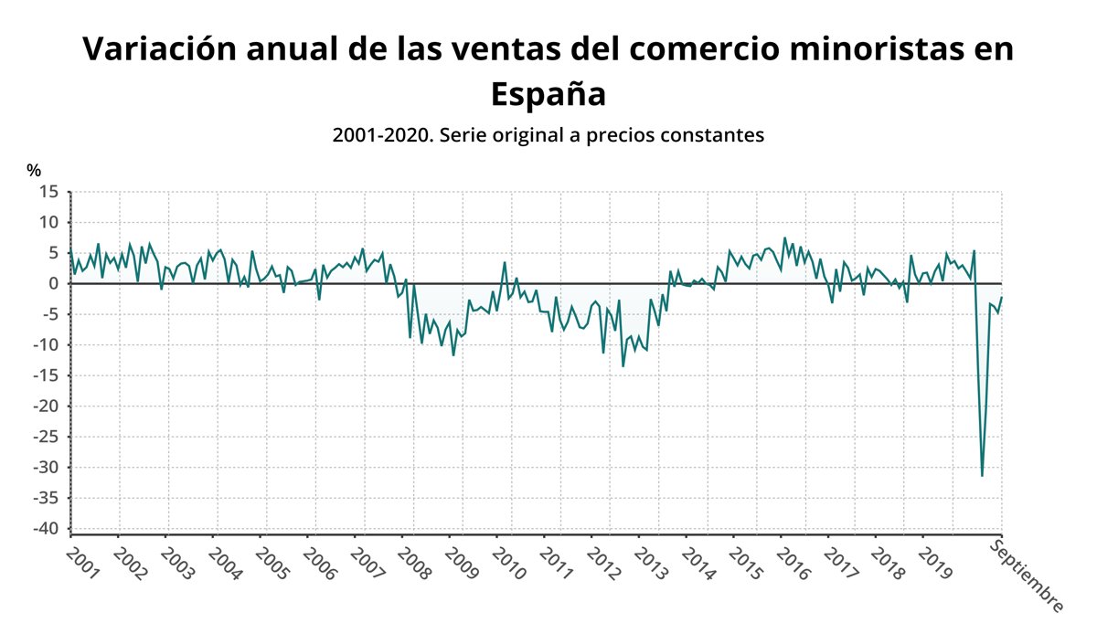 El comercio minorista registró un descenso de sus ventas del 2,1% en septiembre respecto al mismo mes de 2019, moderando en más de dos puntos la caída que habían registrado en agosto (-4,7%), según ha informado este miércoles el Instituto Nacional de Estadística (INE).