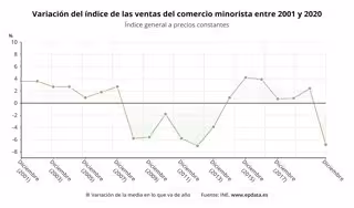 El descenso de las ventas del comercio minorista en 2020 es además el primero que se registra desde 2013, pues llevaba seis años registrando avances anuales. En 2019, las ventas se incrementaron un 2,4%.