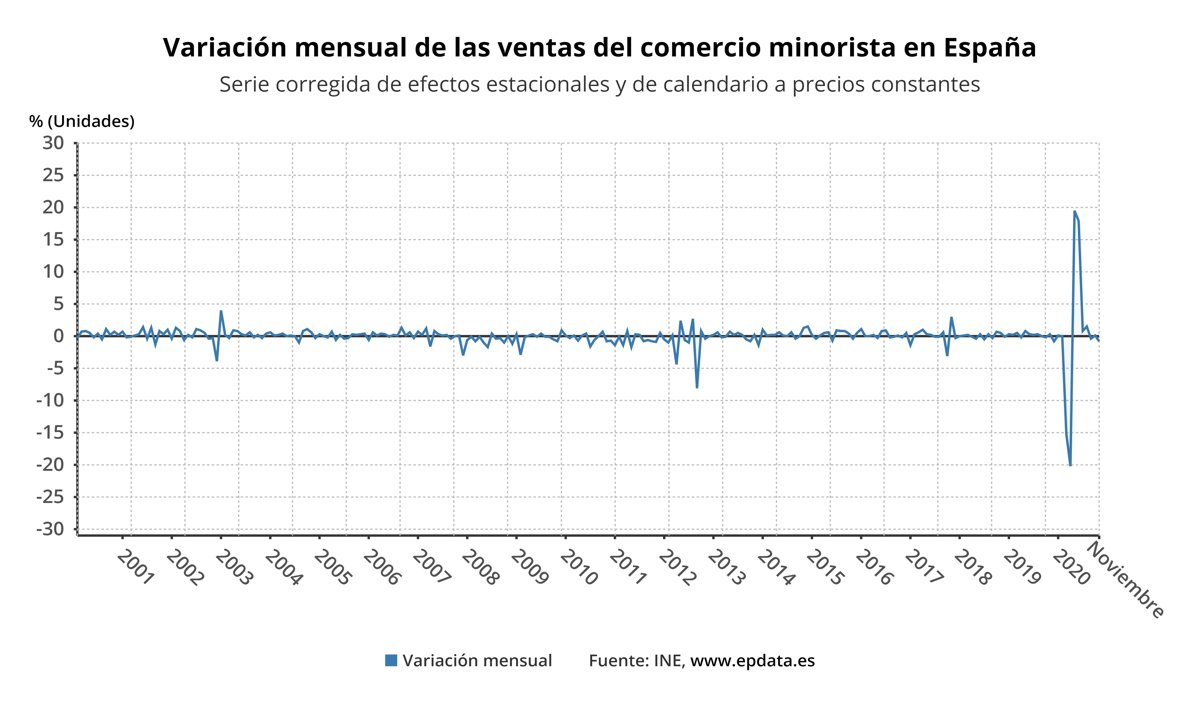 En términos mensuales, y corregido de efectos estacionales y de calendario, la facturación del comercio minorista retrocedió un 0,8% respecto al mes anterior, tasa nueve décimas inferior a la de octubre, pese a la campaña del 'Black Friday'.