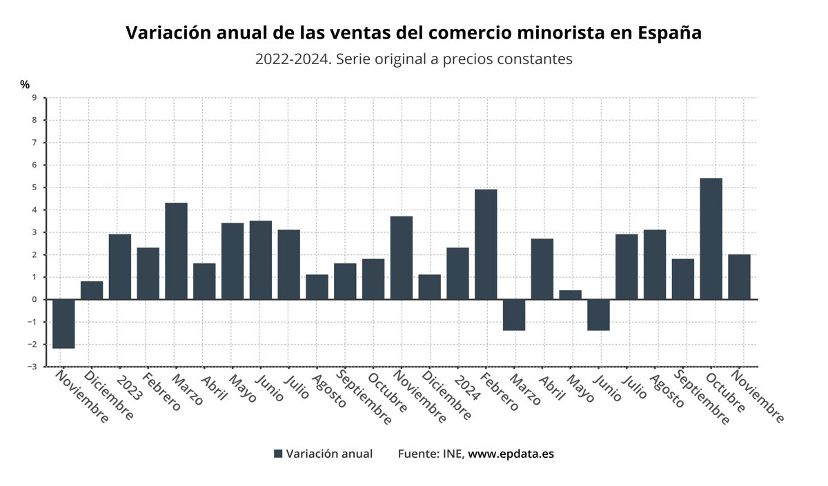 El comercio minorista registró en noviembre un aumento de sus ventas del 2% en relación al mismo mes de 2023, tasa 3,4 puntos inferior a la del mes anterior, según ha informado este viernes el Instituto Nacional de Estadística (INE).