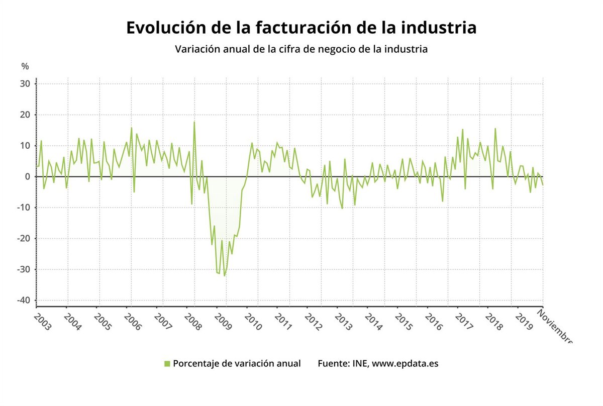 La cifra de negocios de la industria retrocedió un 2,8% el pasado mes de noviembre respecto al mismo mes de 2018, mientras que las entradas de pedidos del sector se desplomaron un 22,3%, según datos difundidos este martes por el Instituto Nacional de Estadística (INE).