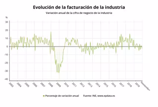 Con el dato de noviembre de 2019, tanto la facturación como los pedidos de la industria regresan a tasas negativas. En octubre, las ventas de este sector subieron un 0,1%, mientras que los pedidos no experimentaron variación.