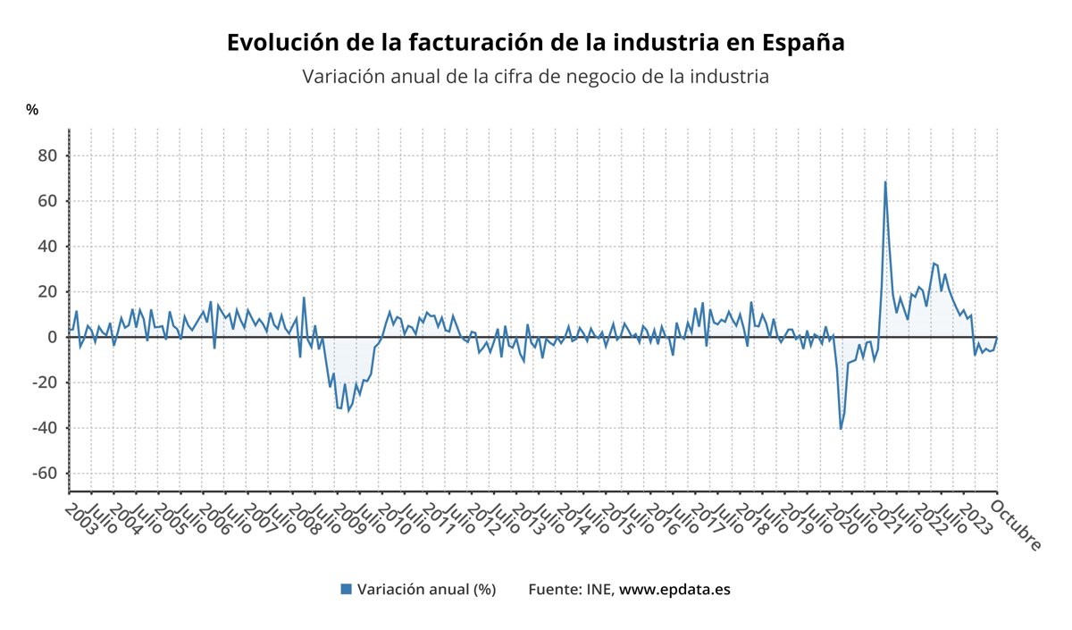 La cifra de negocios de la industria se estancó en octubre en comparación con el mismo mes de 2022, en contraste con los retrocesos interanuales de los seis meses anteriores, según datos difundidos este martes por el Instituto Nacional de Estadística (INE).