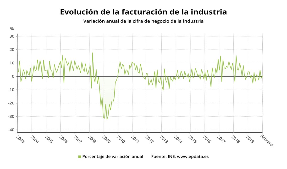 La cifra de negocios de la industria aumentó un 0,5% el pasado mes de febrero respecto al mismo mes de 2019, tasa 1,8 puntos superior a la de enero, según datos difundidos este miércoles por el Instituto Nacional de Estadística (INE).