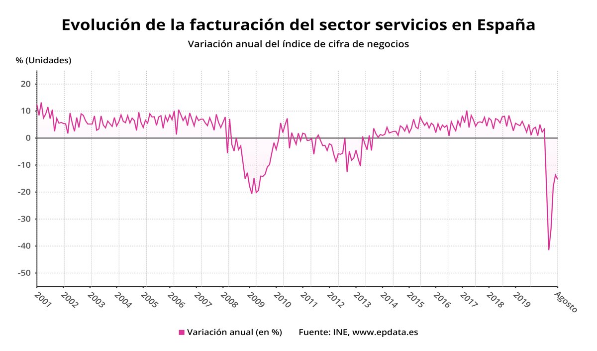 El sector servicios registró un descenso de su facturación del 15,3% en agosto respecto al mismo mes de 2019, ampliando en más de 1,5 puntos la caída que experimentó en julio (-13,7%), según ha informado este miércoles el Instituto Nacional de Estadística (INE).