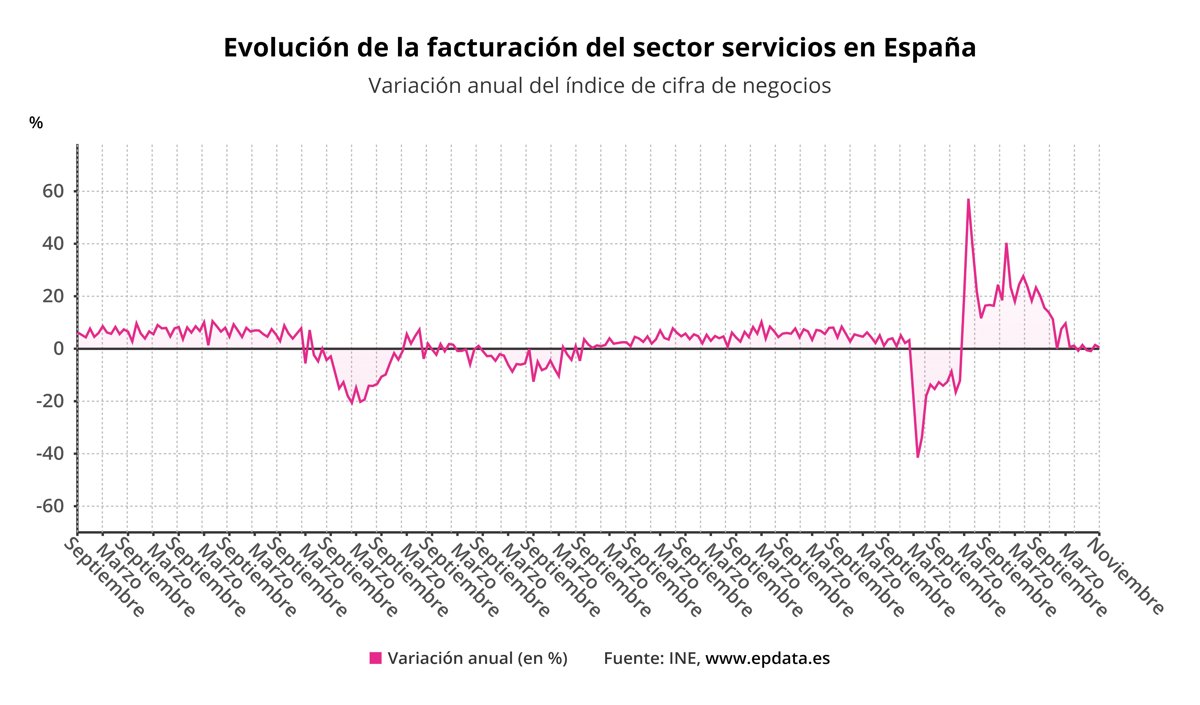 En términos mensuales (noviembre de 2023 sobre octubre del mismo año) y en datos corregidos de estacionalidad y calendario, el sector servicios registró en noviembre un aumento mensual de sus ventas del 1,1%, frente al retroceso del 0,2% del mes anterior.