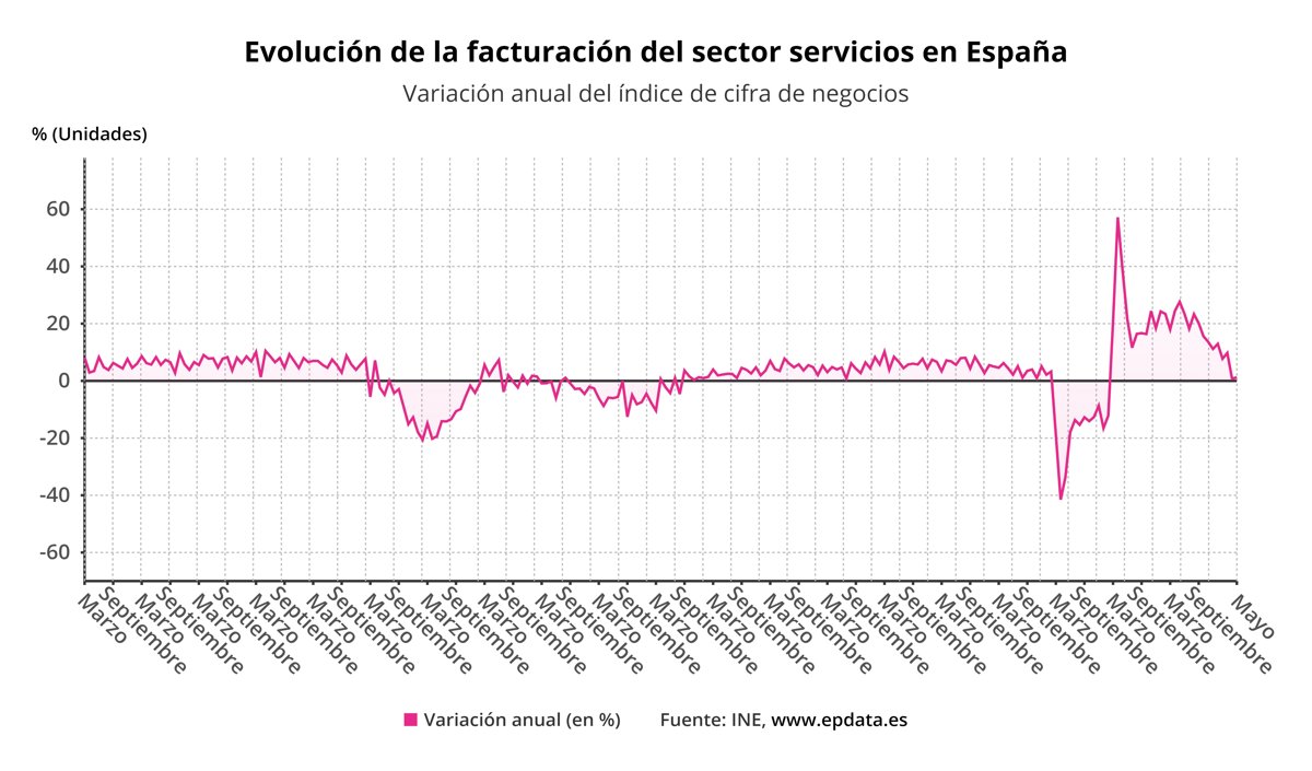 Con el avance de mayo, los servicios encadenan 27 meses consecutivos de subidas interanuales, aunque la de mayo ha sido la menos pronunciada de todo ese periodo.