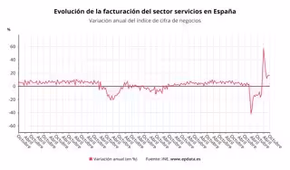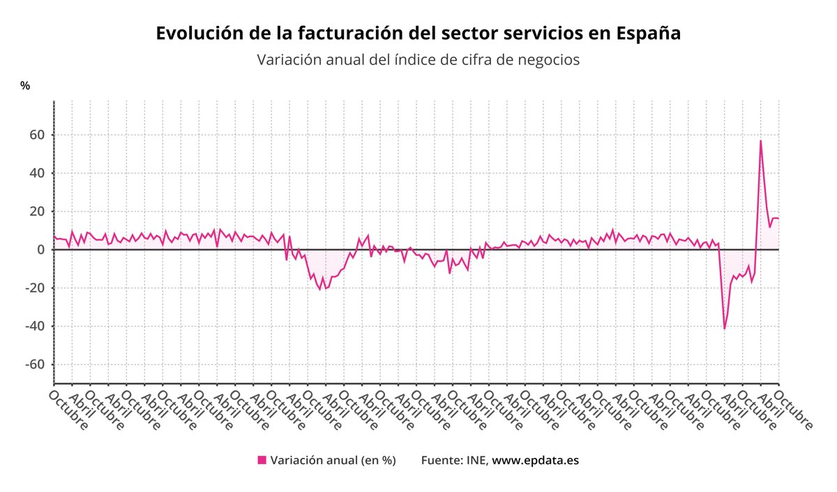 El sector servicios elevó su facturación un 16,3% en octubre respecto al mismo mes de 2020, tasa cuatro décimas inferior a la de septiembre, según ha informado este martes el Instituto Nacional de Estadística (INE).