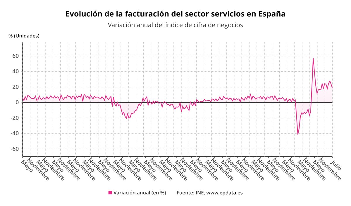 El sector servicios elevó su facturación un 18,3% en julio respecto al mismo mes de 2021, moderando en 5,2 puntos el ascenso registrado el mes anterior, según ha informado este jueves el Instituto Nacional de Estadística (INE).