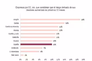 Según el estudio, las compañías de la Comunidad Valenciana y Andalucía son más "pesimistas", en donde el 6% y el 7%, respectivamente, percibe un aumento del riesgo derivado de sus deudores. Las empresas aragonesas encabezan el ranking (19%), seguidas de las gallegas (14%) y las manchegas y murcianas (12% en ambos casos).
