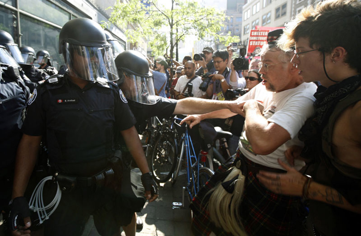 Unas 10.000 personas participaron este sábado en una protesta masiva contra los dirigentes de los principales países desarrollados y las economías emergentes, el G-20, reunidos hoy y mañana en Toronto, Canadá. Pequeños grupos de encapuchados se enfrentaron esporádicamente a los policías, equipados con material antidisturbios, y varios manifestantes tuvieron que ser atendidos por heridas y contusiones.