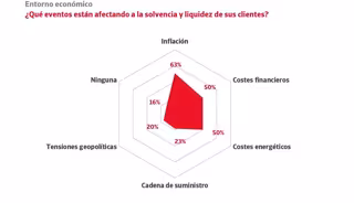 Como causa principal del deterioro del riesgo de crédito y de la capacidad de pago de su cartera comercial, el tejido productivo señala especialmente el incremento de la inflación (mencionado por el 63% de las empresas), seguido del crecimiento de los costes financieros (50%), la evolución de los costes energéticos (50%), los problemas de la cadena de suministro (23%) y las tensiones geopolíticas (20%).