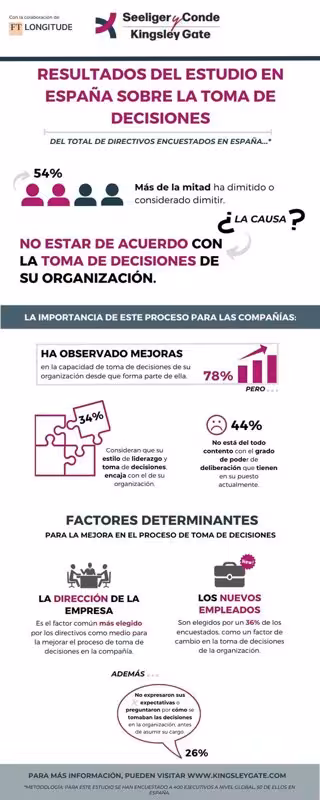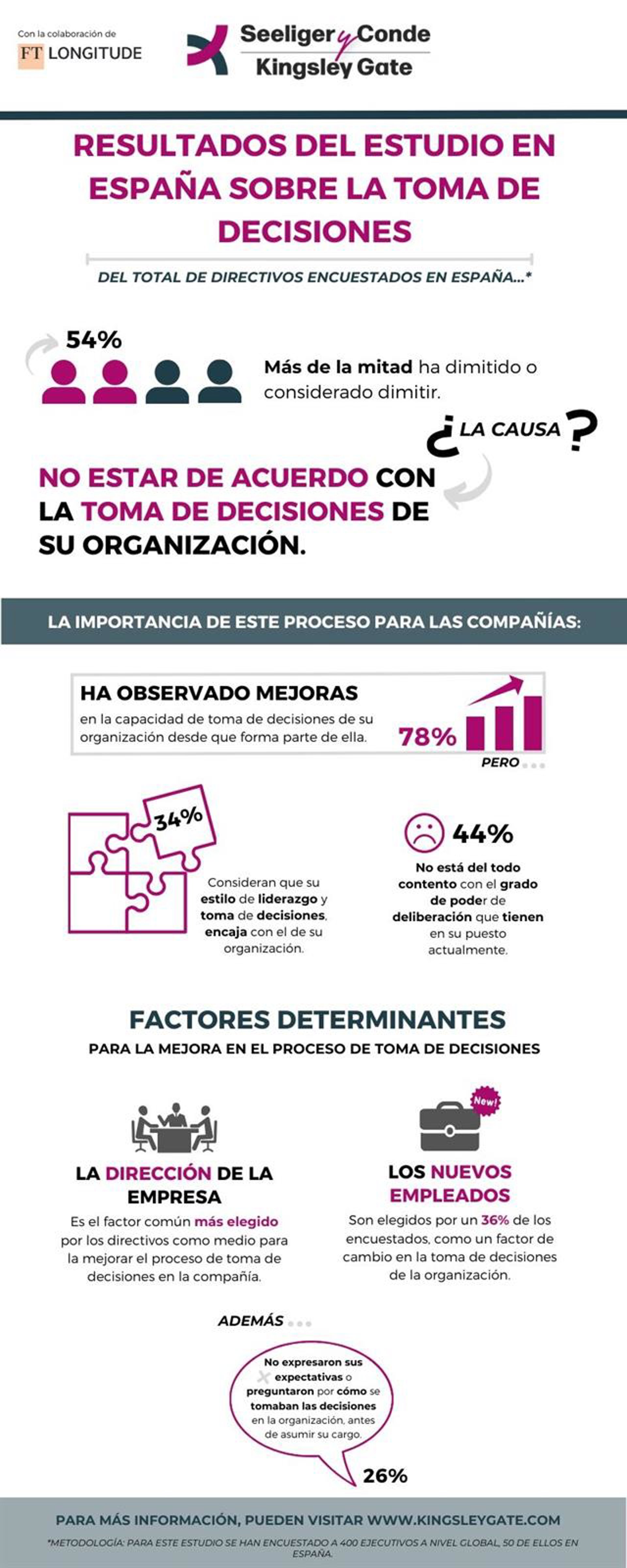 El 54% de los directivos en España ha dimitido o se plantea hacerlo debido a su desacuerdo con los procesos de toma de decisiones de la compañía, según revela un estudio de Seeliger y Conde Kingsley Gate en colaboración con FT Longitude, parte del grupo de 'Financial Times'.