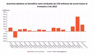 MADRID, 26 Jul. (EUROPA PRESS) - Acerinox registró un beneficio neto de 278 millones de euros en el primer semestre del año, lo que representa una caída del 54% con respecto a las ganancias récord de 609 millones de euros que obtuvo en el mismo periodo del ejercicio anterior, ha informado este miércoles la compañía a la Comisión Nacional del Mercado de Valores (CNMV).