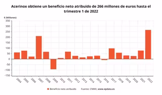 Acerinox registró un beneficio neto de 266 millones de euros en los tres primeros meses de este año, cifra que multiplica por más de tres (+242%) la del mismo periodo de 2021 y es un 34% superior a la del trimestre anterior, según ha informado este miércoles la compañía, que ha destacado que el resultado del primer trimestre de este año es el mejor de su historia.