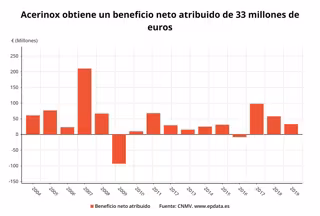 Acerinox registró un beneficio neto de 33 millones de euros en el primer trimestre de este año, lo que supone un descenso del 43,9% respecto al mismo periodo de 2018, según ha informado este lunes la compañía a la Comisión Nacional del Mercado de Valores (CNMV).