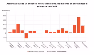 Acerinox obtuvo un beneficio neto de 348 millones de euros en los nueve primeros meses de este año, lo que supone un descenso del 53% respecto al mismo periodo de 2022, cuando ganó 741 millones de euros, según ha informado este viernes la compañía a la Comisión Nacional del Mercado de Valores (CNMV).