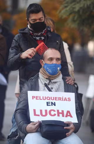 Archivo - Un peluquero peina a un hombre durante una concentración frente al Congreso de los Diputados, en Madrid - Eduardo Parra - Europa Press - Archivo