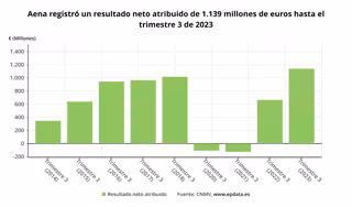 El gestor aeroportuario Aena registró un beneficio neto de 1.139 millones de euros en los nueve primeros meses del año (con extraordinarios financieros) lo que supone un 71,3% más que lo registrado en el mismo periodo de 2022 (664,7 millones de euros), y una cifra similar a la registrada en 2019 (1.114,2 millones de euros), según informó este jueves la compañía a la Comisión Nacional del Mercado de Valores (CNMV).